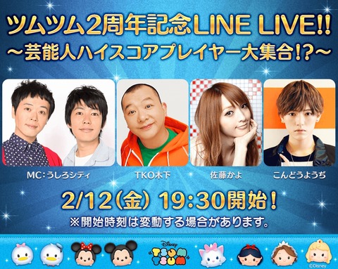 LINE:ディズニー ツムツム 2016年02月09日 【2/12(金)19:30~】ツムツム特別番組をLINE LIVEで配信!TKO木下さん、佐藤かよさん、こんどうようぢさんら出演 「LINE:ディズニー ツムツム」2周年を記念して、3回目となるLINE LIVEを実施します!LINE公式アカウントやLIVEアプリから、ツムツムの特別番組をリアルタイムでお楽しみください!