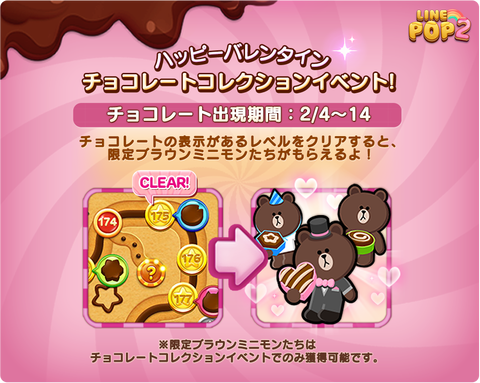 キャンペーン LINE POP2 2016年02月04日 「LINE POP2」でバレンタインイベント開催!チョコレートを集めて限定ミニモンをゲットしよう♪ 6角形パズルゲーム「LINE POP2」で、バレンタインを記念した「ハッピーバレンタイン★チョコレートコレクション」イベントが始まりました!バレンタインイベントに参加して、期間限定のミニモンをGETしてみませんか?【期間】2016年2月14日(日)まで