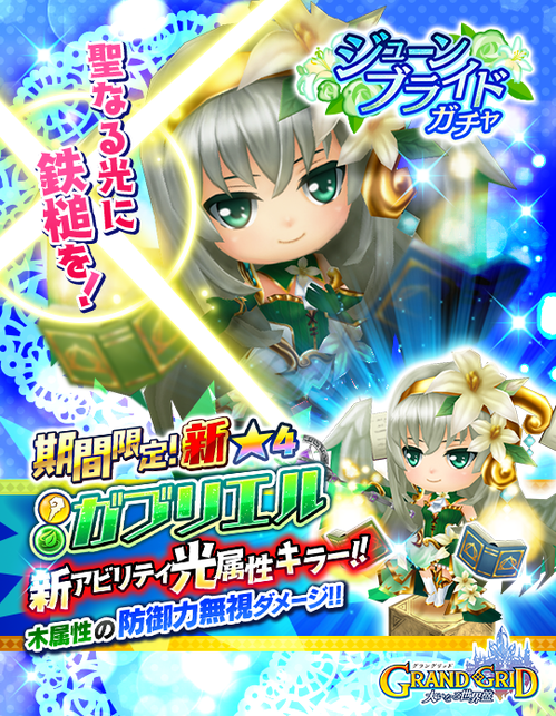 2017年06月05日 【LINE グラングリッド】ジューンブライドイベント開催!1日1回無料ガチャも開催! 指先タクティカルRPG「LINE グラングリッド」で、ジューンブライドイベント開催です!「★4 天啓の熾天使 ガブリエル」が期間限定で出現するほか、新イベントの「防衛クエスト」や「ログインボーナスも!今から「LINE グラングリッド」を始める方も一気に成長するチャンスで