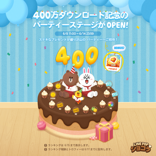 LINE POPショコラ キャンペーン 2017年06月08日 【LINE POPショコラ】世界累計400万ダウンロード突破!記念マップや限定デコが登場するイベント開催! ブラウンが伝説のチョコを求めて世界中を大冒険する「LINE POPショコラ」が、2017年6月3日に世界累計400万ダウンロードを突破しました!これを記念したマップや、限定デコなどが登場するキャンペーンを開催します。ぜひご参加くださいね♪