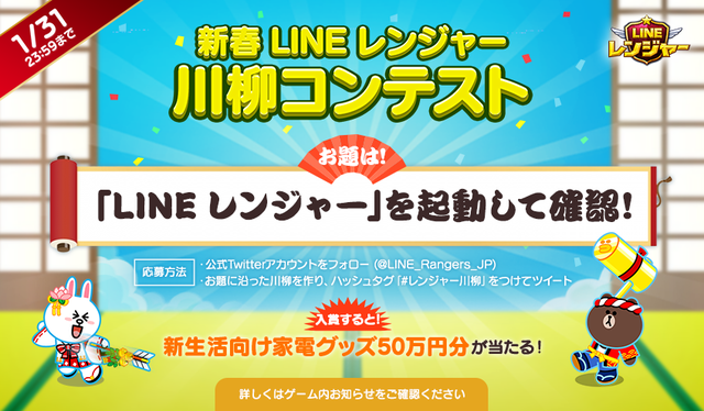 LINE レンジャー キャンペーン 2018年01月18日 【LINE レンジャー】第1回 新春「LINE レンジャー」川柳コンテスト開催! 防衛バトルゲーム「LINE レンジャー」では、第1回 新春「LINE レンジャー」川柳コンテストを開催します!川柳を作って応募すれば豪華プレゼントがあたるかも!さらに、新春イベントもまだまだ続きます!ぜひチェックしてくださいね☆