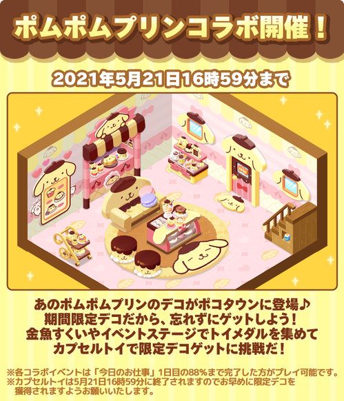 LINE ポコパンタウン コラボ 2021年04月30日 【LINE ポコパンタウン】『ポムポムプリン』とコラボレーション! 町づくり×1タップパズルゲーム「LINE ポコパンタウン」と『ポムポムプリン』がコラボレーション!コラボ限定なかまや、限定デコが登場しますので、ぜひ手に入れてくださいね♪【コラボ期間】2021年4月30日(金)~5月21日(金)16:59まで■コラボ記念デコが登場!期間中、とって