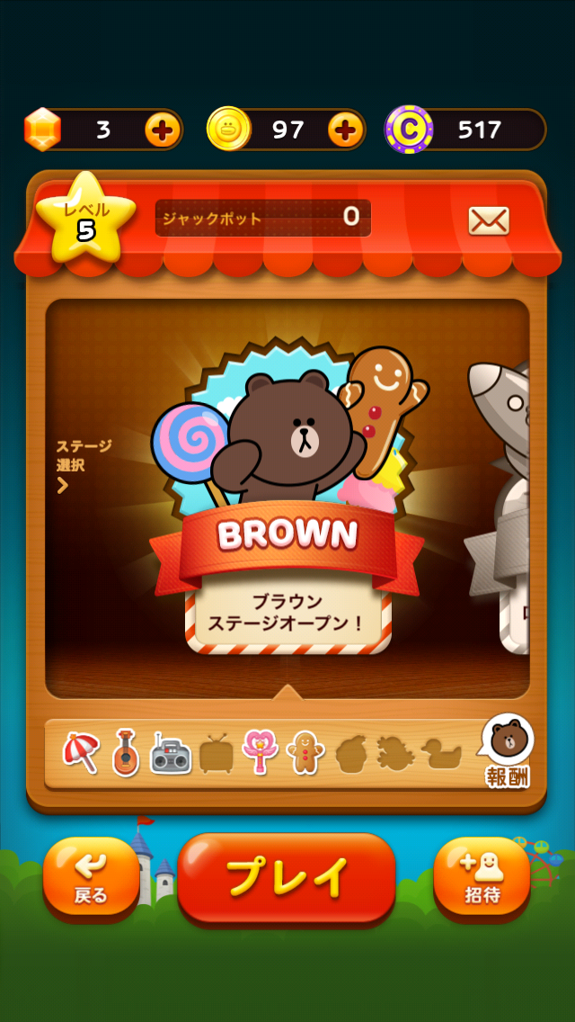 ブラウン・ムーン・コニーなど、各LINEキャラクターのステージがあり、コインを落としてレベルを上げたり、チップを貯めたりすると新しいステージをプレイすることができます。