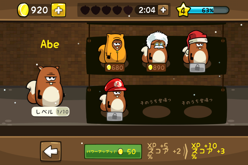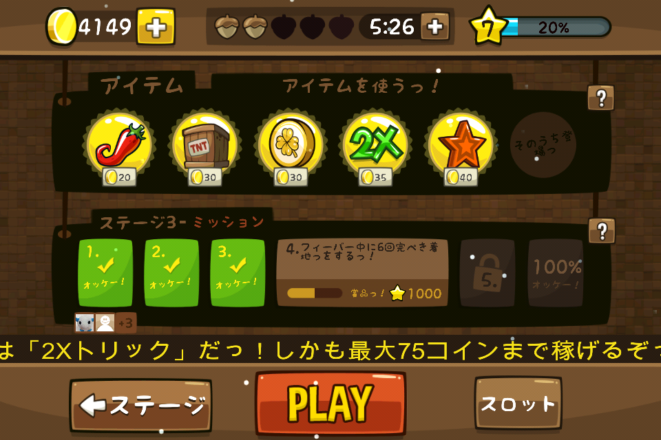 「障害物を4回壊す」「バック宙を20回する」「合計で1,7000,000点をゲットする」など、3つのステージで5つのミッションが出され、クリアするごとにボーナスやコインをGETできます。