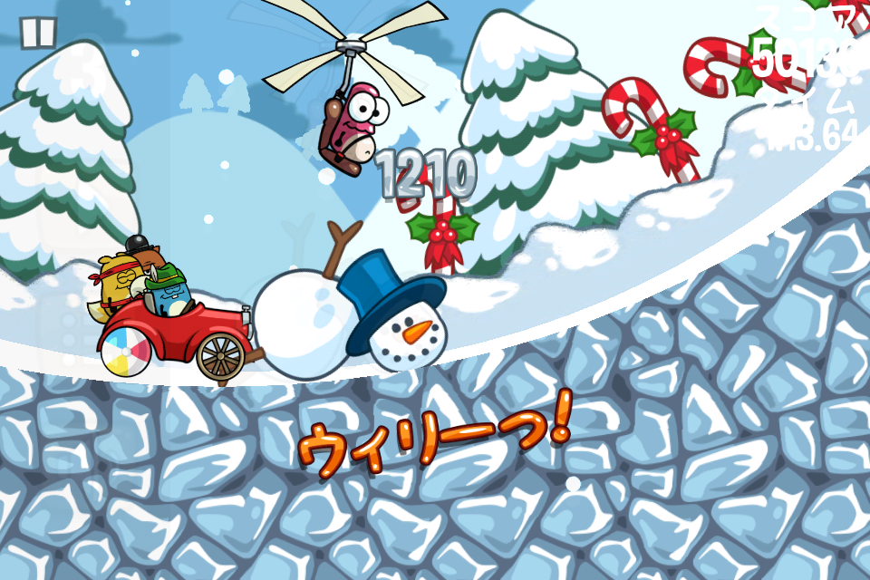 プレゼントボックスやスノーマンを飛ばしながら駆け抜け、雪景色を楽しんでください。