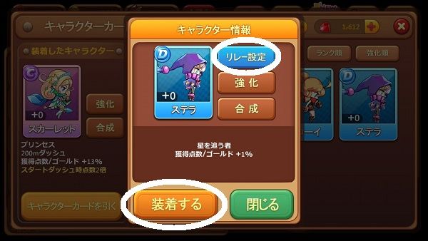 「キャラクター情報」ウィンドウが表示され、ここでキャラクターカードの装着やリレー設定ができます。