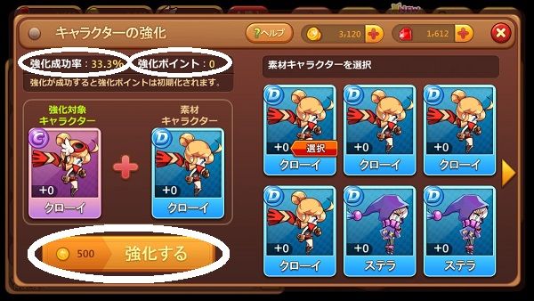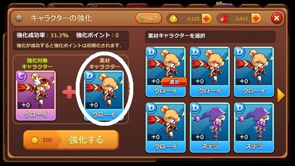 今選択されている素材キャラクターはD+0クローイですが、他のキャラクターをタップして変更もできます。 素材キャラクターは1回使用すると消えてしまうので慎重に選びましょう。
