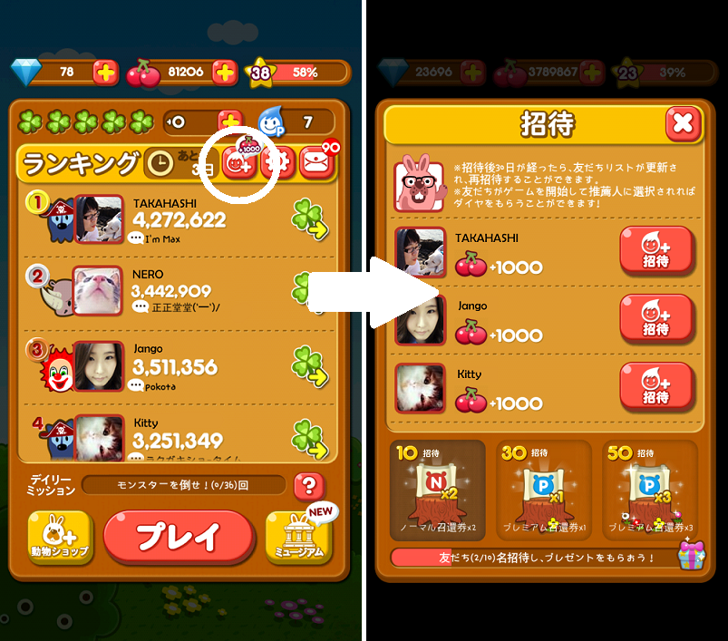 たくさん招待するほど強い動物を召喚できるチャンスが広がります。