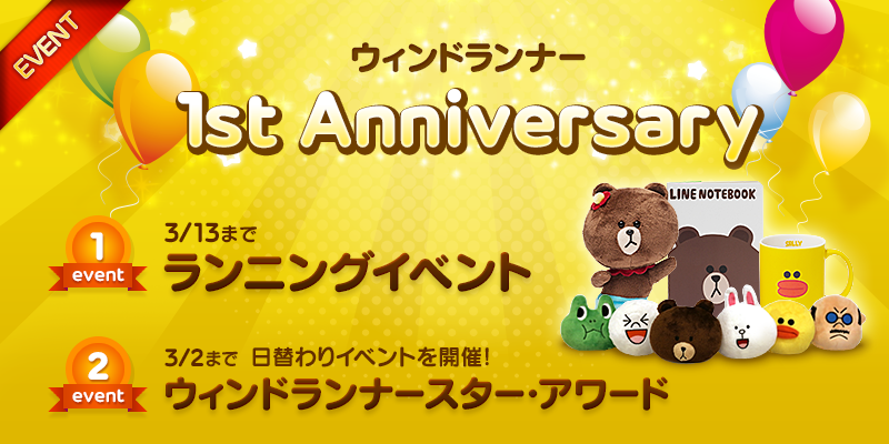 おかげさまで、爽快ランニングアドベンチャーゲーム「LINE ウィンドランナー」が1周年を迎えます。今回、2週間限定のランニングイベントを開催!たくさん走って豪華ゲームアイテム&LINEグッズをGETしてください!