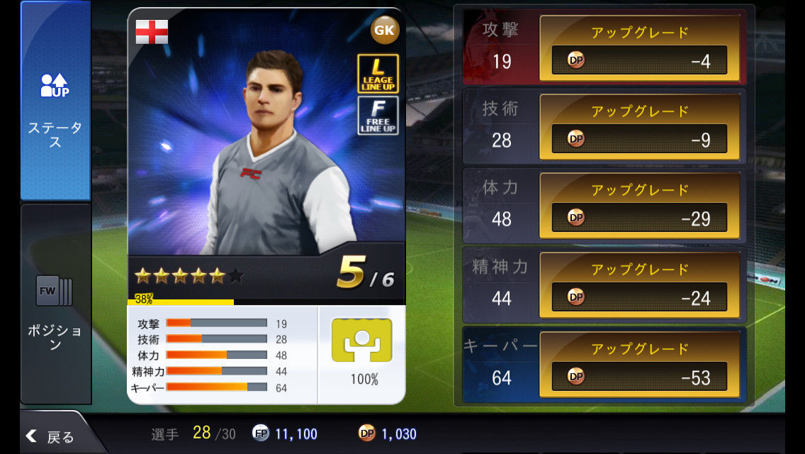 【選手管理】メニューでは、選手カードを強化してアップグレードできるほか、「攻撃」「体力」などのスキルごとや特定ポジションでの技術をアップグレードして、選手を育成することができます。