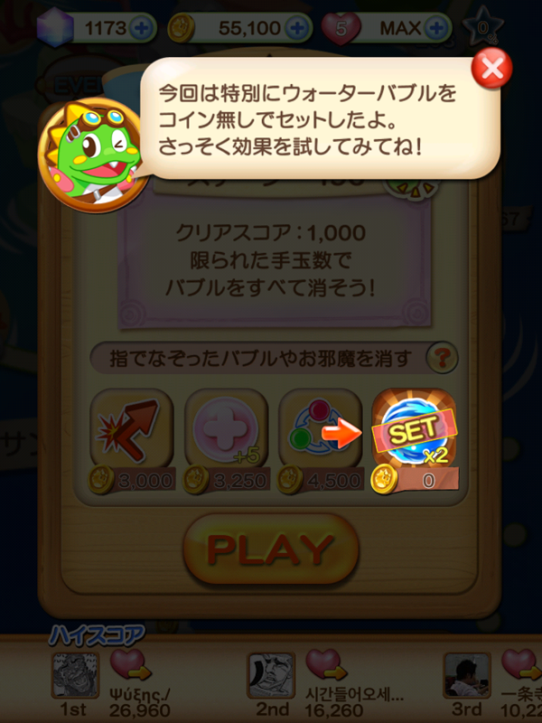 今回のバージョンから、初めて登場するアイテムが、そのステージをクリアするまで何度でも無料で使えるようになりました。新アイテムの「ウォーターバブル」はもちろん、61ステージで登場する「スカルバブル」など、過去のステージでも初めて出てくるアイテムは無料で使えるようになります。※ステージクリアすると無料にはなりません。