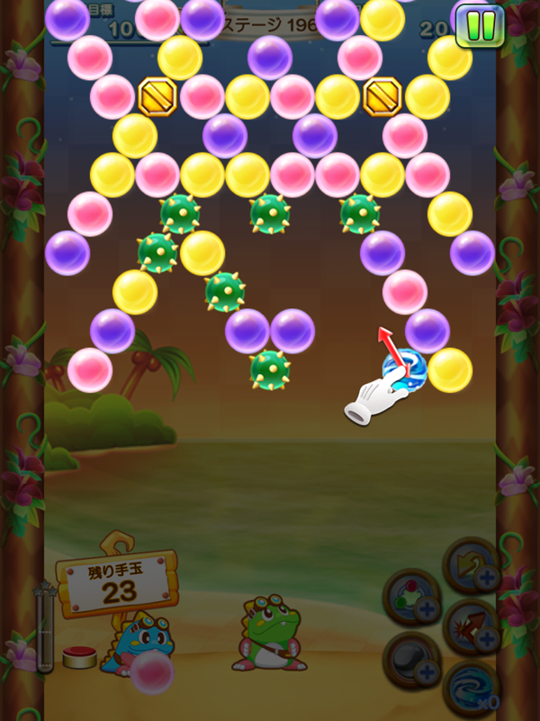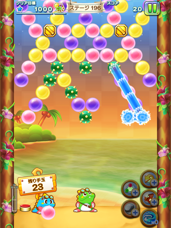 サンゴ島から登場する新アイテムは「ウォーターバブル」。バブルがはじけると中の水が流れて周りのバブルや障害を消してくれます。しかも水は指でなぞった通りに流れてくれるので、おじゃまな障害も思い通りに消せる超強力なアイテムです。