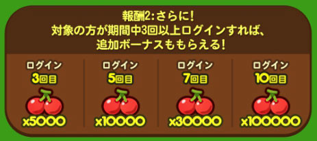 対象の方が期間中3回以上ログインした場合、追加でさらにチェリーがもらえます!