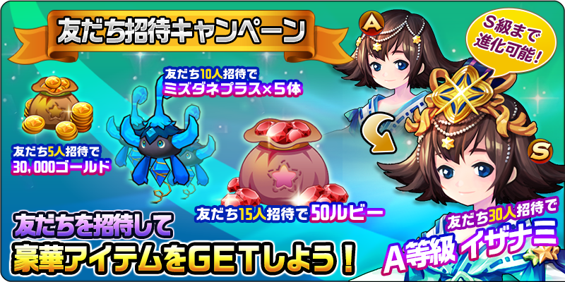 ■友だち招待キャンペーン招待した友だちの数に応じて、ルビーやA等級の召喚獣(最終進化S等級)をプレゼント!