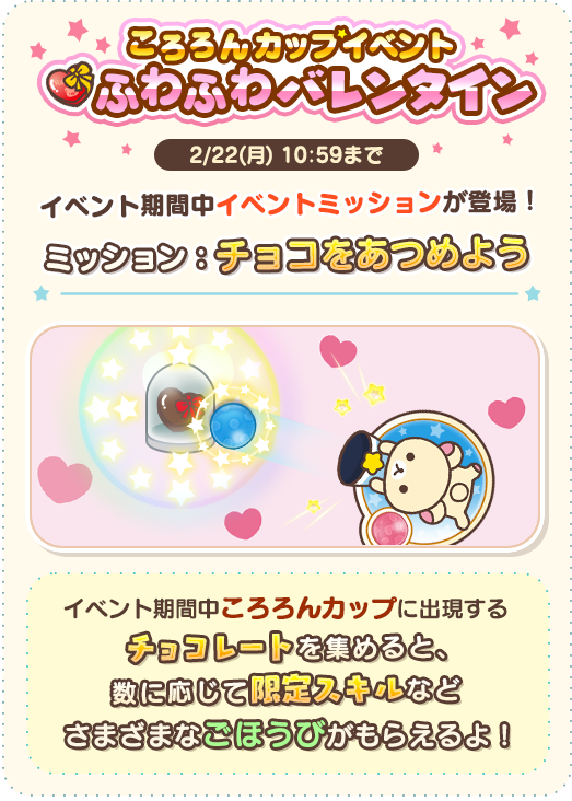 今回のイベントでは、2月22日までの「ころろんカップ」がバレンタインスペシャルに模様替え!お得なアイテムがもらえるログインスタンプなどイベント盛りだくさんですよ♪