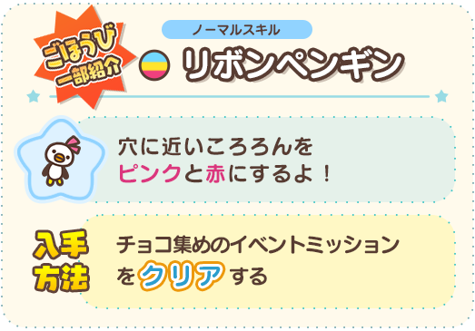 『リボンペンギン』は先頭から一定範囲のころろんをピンクや赤のハート色に変えてくれる便利なスキル♪ピンク色のころろんは高得点なので、スキルを使ってたくさん消しましょう!