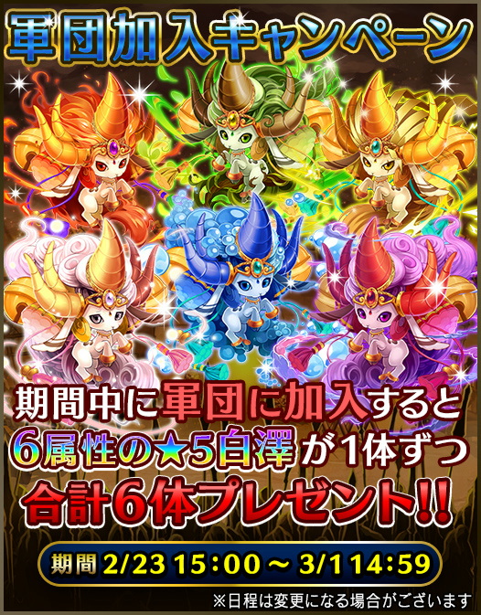 期間中に軍団に加入すると、各属性の「★5白澤」を1個ずつ、計6個プレゼントいたします。