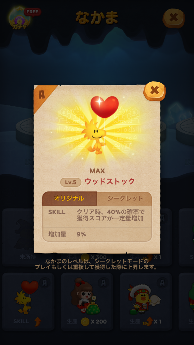 オリジナルモードでステージクリア時に獲得点数にボーナスを追加するスキルと、シークレットモードで爆弾を活用するスペシャルスキルを持つウッドストックをGETして、コニーの冒険のお供にしましょう♪