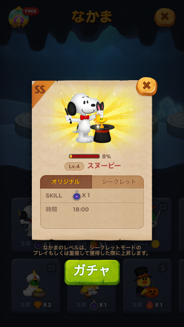 期間限定で、プレミアムガチャに限定なかま「スヌーピー」が登場します!オリジナルモードでマジックミラーを生産するスキルと、シークレットモードでバブル7列を消すスペシャルスキルを持つスヌーピーをこの機会にGETしてくださいね♪