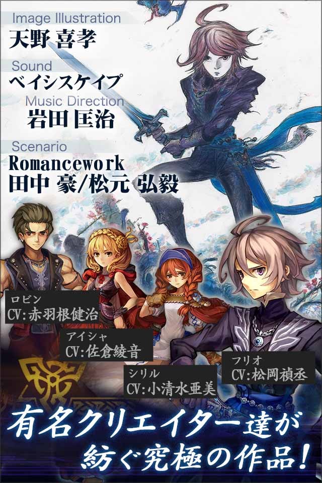 イメージイラストに天野喜孝氏、ミュージックディレクションにベイシスケイプの岩田匡治氏、シナリオにRomanceworkの田中豪氏・松元弘毅氏ら豪華クリエイターが集結し、声の出演には主人公フリオに松岡禎丞氏のほか、佐倉綾音氏・小清水亜美氏・赤羽根健治氏など人気声優が勢ぞろいしています!