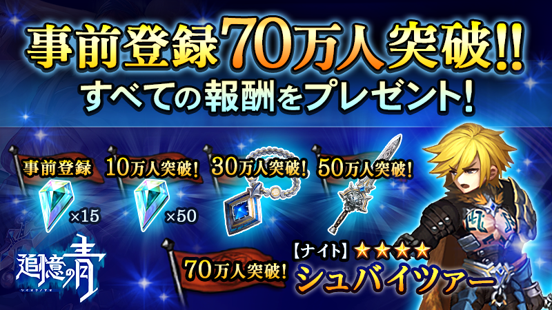 事前登録者数70万人突破を記念し、登録者数に応じて用意したダイヤなどの特典をすべてプレゼントいたします!全ユーザーがスタートダッシュする大チャンス!皆さんのプレイをお待ちしています。