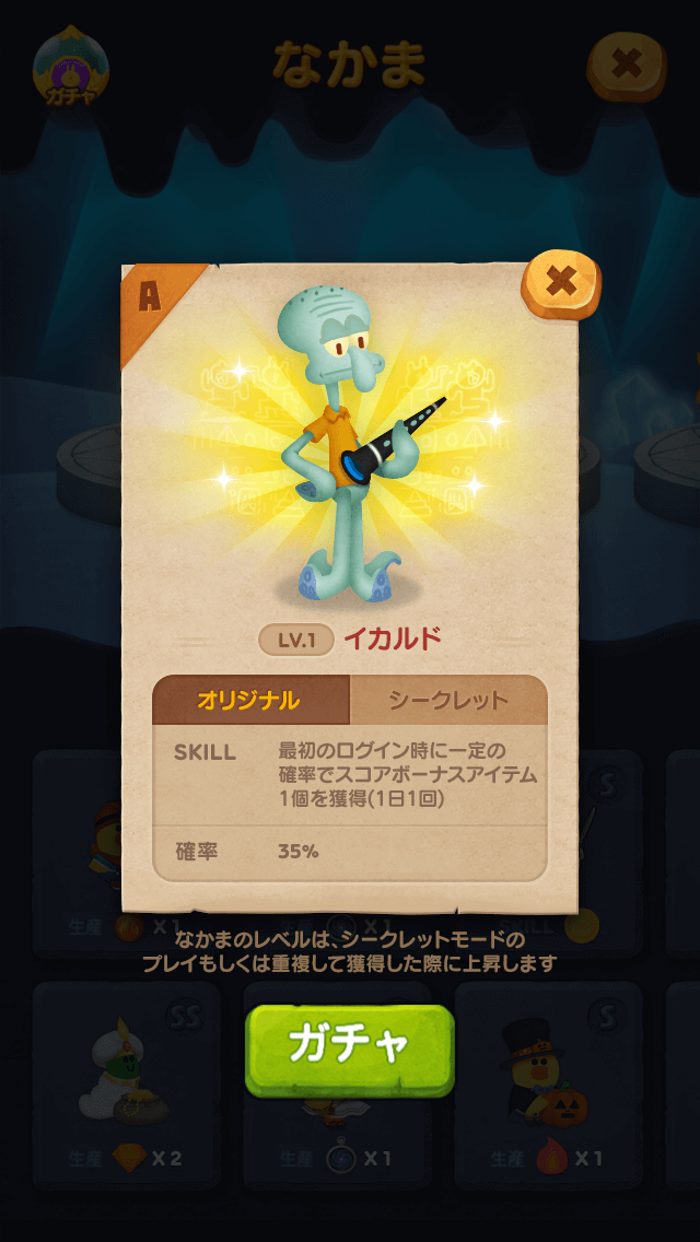 スペシャルバブルを指定数消して集めると、Aランクの限定なかま「イカルド」がランダムで獲得できるスロットを回すことができます。