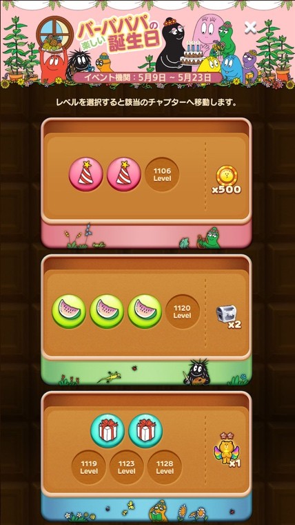 5月9日からパズルピースのコレクションイベントを開催します。指定した通常ステージをクリアしてパズルピースを一定数集めるとコラボミニモンを手に入れることができます。5番目のピース獲得でバーバララ(★3)を獲得できます。