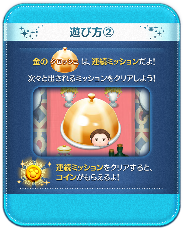 5月のイベント「ルミエールのおもてなし」は、通常ミッションと連続ミッションの2種類のミッションに分かれています。「銀のクロッシュ」で運ばれてくる通常ミッションは、1プレイで1つのミッションをクリア、「金のクロッシュ」で運ばれてくる連続ミッションは、1プレイで指定された数のミッションをクリアしましょう。