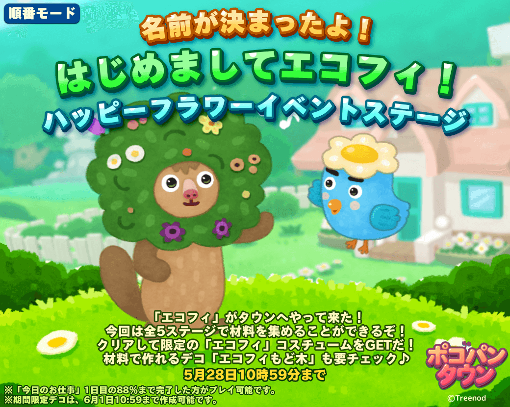 町づくり×1タップパズルゲーム「LINE ポコパンタウン」では、「はじめましてエコフィ!ハッピーフラワーイベントステージ 」を開催します。