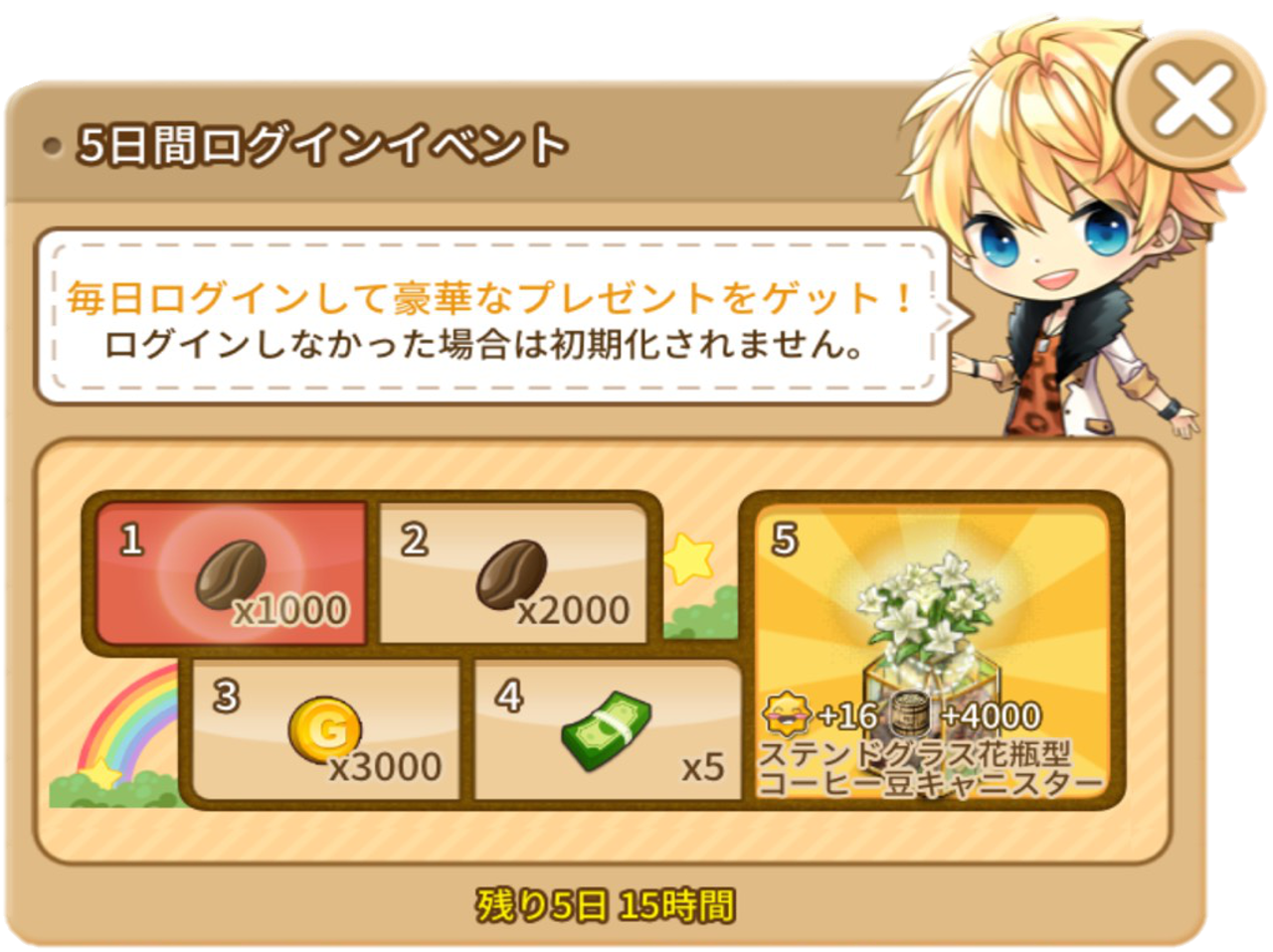 期間中に通算5日ログインすることで最終報酬が受け取れるボーナスイベントです~。