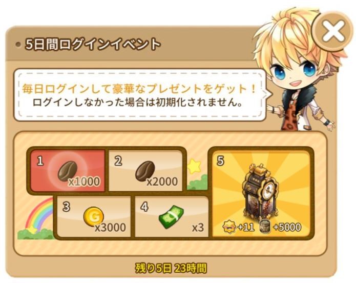 期間中に5日間分ログインして、5段階のプレゼントをもらっちゃいましょう!