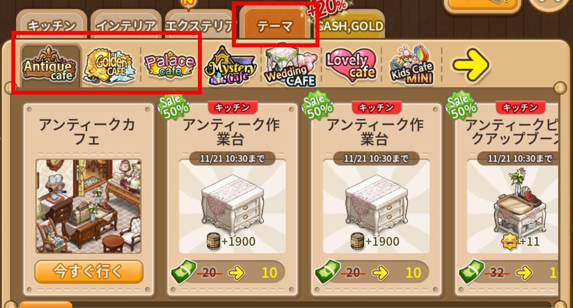 テーマのコーナーには雰囲気が似たインテリアからマシン類までそろっているので、インテリアに自信がない間はこのタブからインテリアを選んで買えば、簡単にまとまりのあるカフェが作れますよ~。