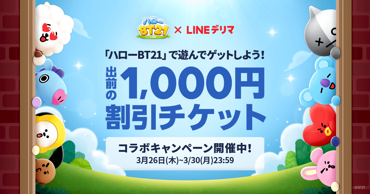 イベント期間中、「LINE ハローBT21」にログインすれば、「LINEデリマ」の初めての出前注文で使える1,000円割引チケットをプレゼント!