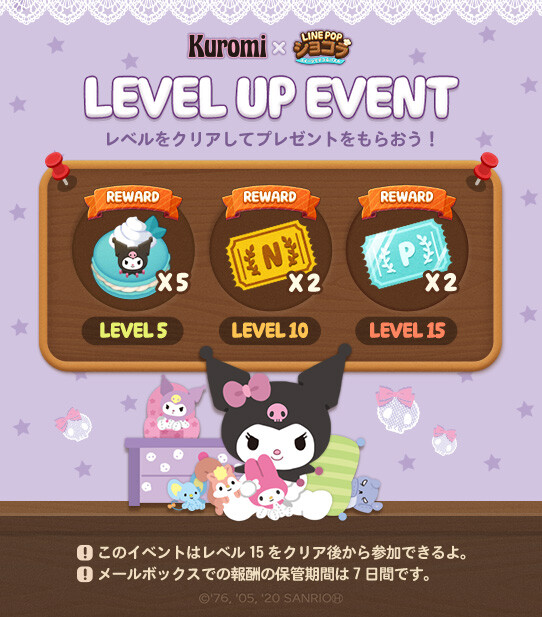 期間中、ステージクリアを応援する「レベルアップイベント」、イベントポイントを集める「ギフトハウス」、「パーティーハウス」イベントで「クロミ」のコラボアイテムが手に入ります!ぜひ、挑戦してみてくださいね♪