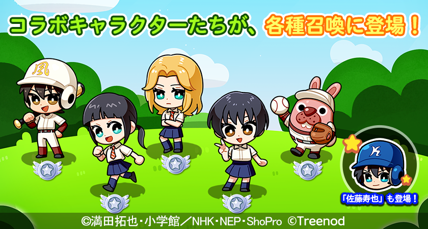期間中、召喚に「茂野 大吾」「佐倉 睦子」「相楽 太鳳」「沢 弥生」「佐藤 寿也」「球児ポコタ」が登場します!