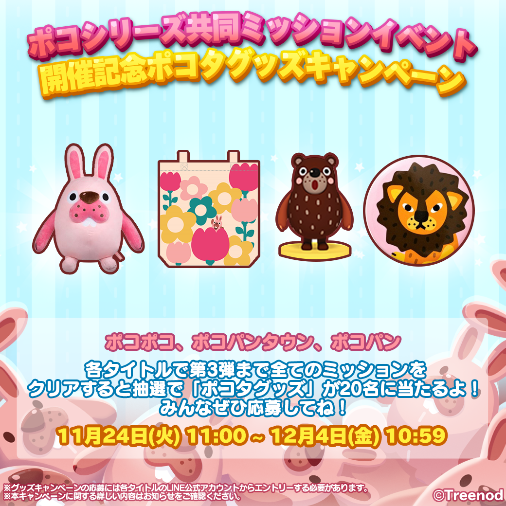 さらに、「LINE ポコポコ」、「LINE ポコパン」、「LINE ポコパンタウン」それぞれのタイトルで第1弾~第3弾まで全てのミッションをクリアしたユーザーから抽選でポコタグッズが当たるキャンペーンを同時開催!ぜひすべてのミッションをクリアして限定ポコタグッズに応募してください!