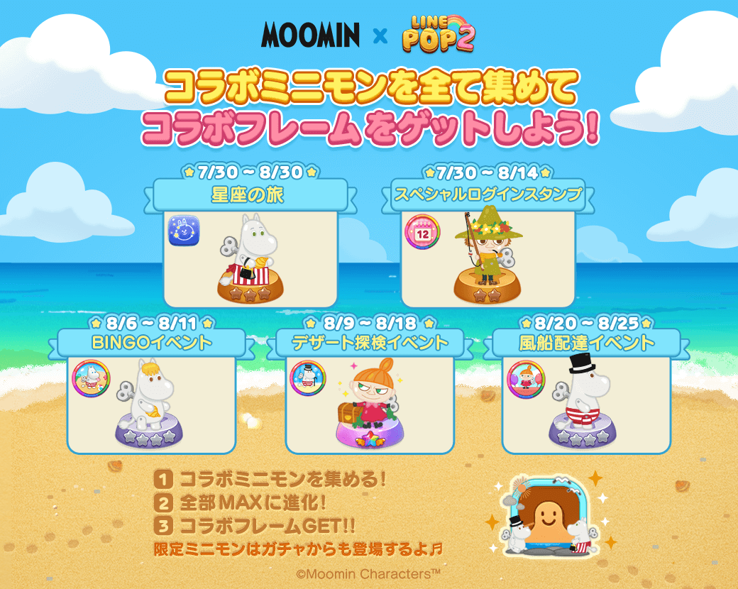 POP2」と「ムーミン」がコラボレーションを実施します。本コラボレーションでは、プレイを助けてくれる限定コラボミニモンとして全7種「ムーミン」「スノークのおじょうさん」「ムーミンパパ」「ムーミンママ」「スナフキン」「リトルミイ」「ムーミン&スノークのおじょうさん」が期間限定にてゲーム内に登場します。