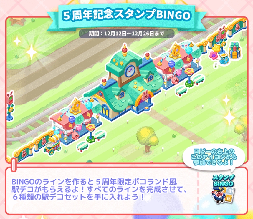 BINGOのラインを作ると5周年限定ポコランド風駅デコがもらえます!