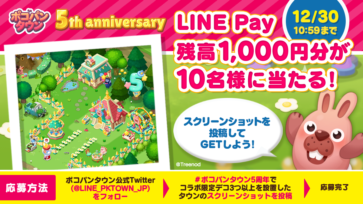 「LINE ポコパンタウン」の公式Twitterをフォローし、期間中に獲得できる5周年記念デコを3個以上設置したスクリーンショットをハッシュタグをつけてTwitterに投稿すると、抽選で10名様に『LINE Pay 残高1,000円分』が当たります!