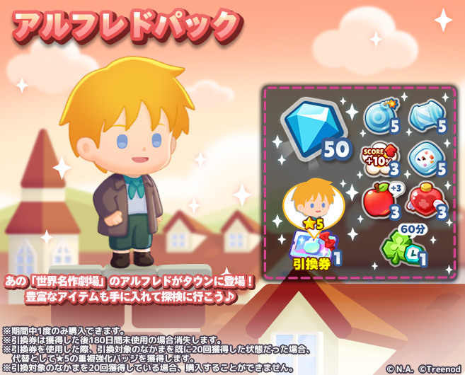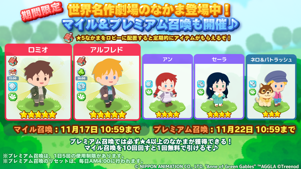 パッケージには「★5 ロミオ」、「★5 アルフレド」、「★4 セーラ」に、イベントをクリアで「★4 アン」、「★3 あらいぐまラスカル」、ログインボーナスでは「★3 ネロ&パトラッシュ」が登場します♪