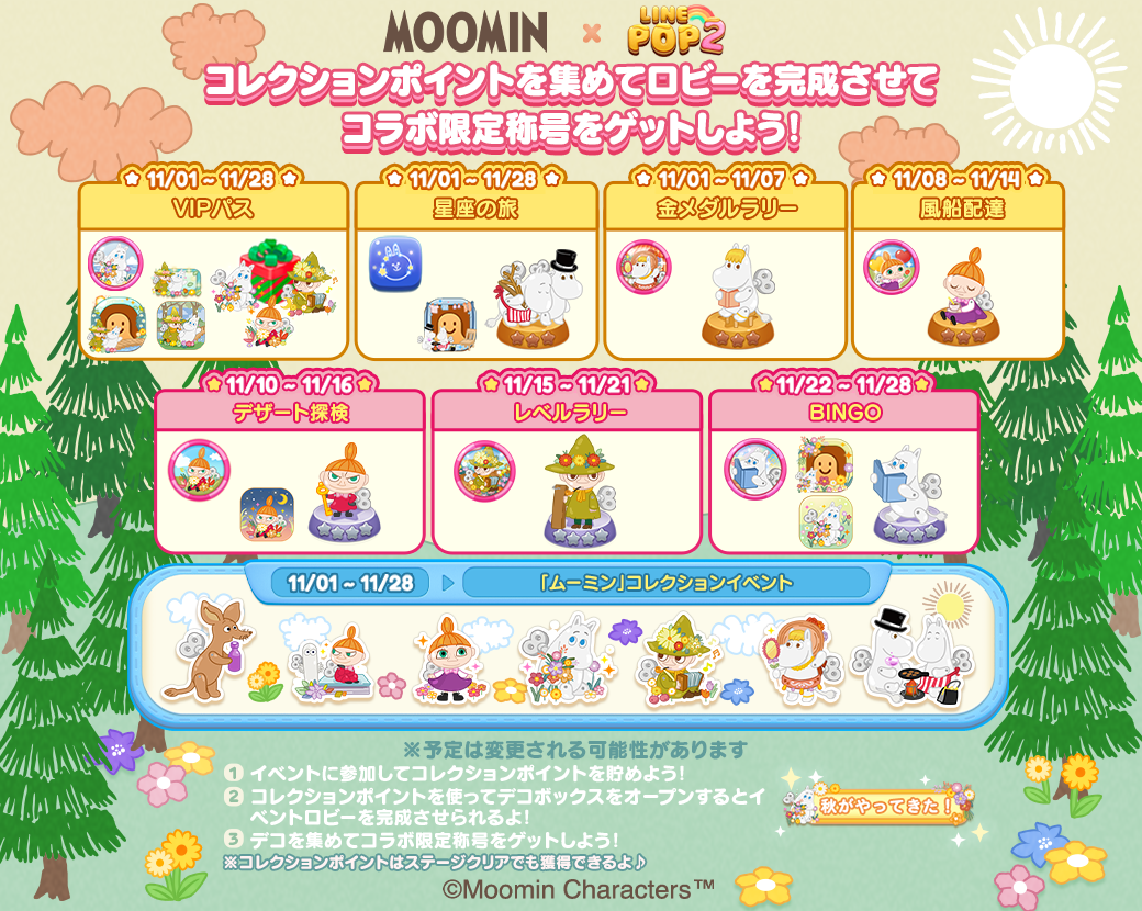 今回のコラボでは、「LINE POP2」に「秋のムーミン」「秋のスナフキン」をはじめとする仲間たちが登場します。