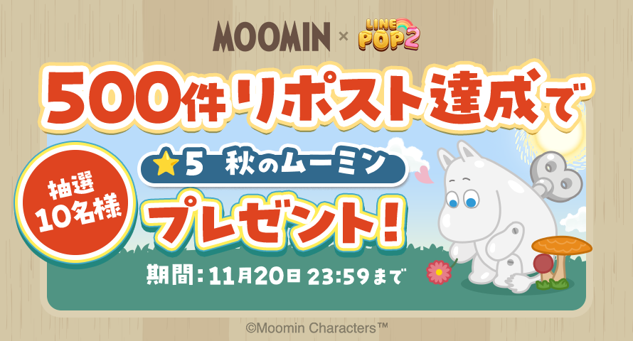「LINE POP2」公式X(旧Twitter)のフォローと該当のキャンペーン投稿をリポストした合件数が500件を達成すると、抽選で10名様に「★5 秋のムーミン」のコラボ限定ミニモンが当たるフォロー&リポストキャンペーンを開催します!