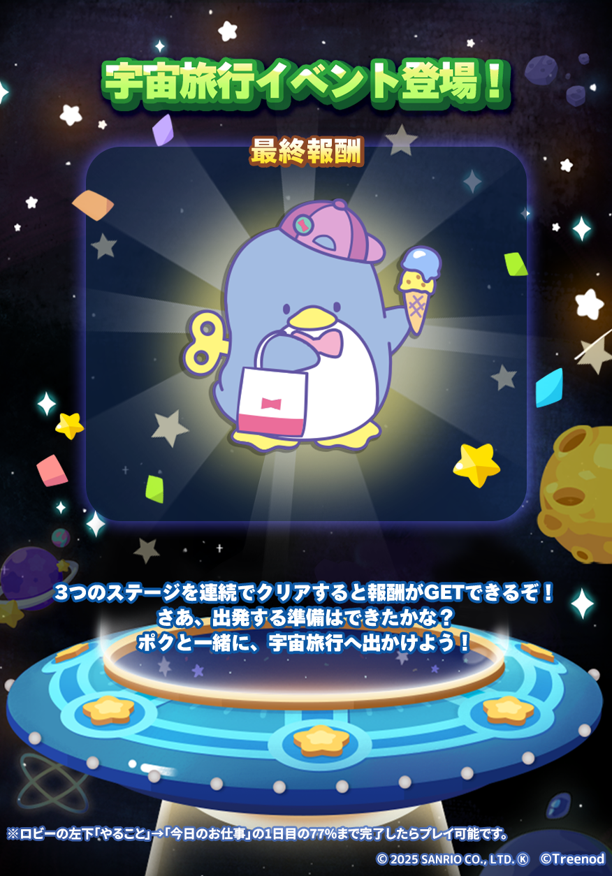 パッケージには「★5 ポチャッコ」、「★5 けろけろけろっぴ」、「★4 ハンギョドン」、宇宙旅行クリアで「★4 タキシードサム」、連続モードクリアで「★3 あひるのペックル」、探検イベントクリアで「★3 バッドばつ丸」を獲得できます!