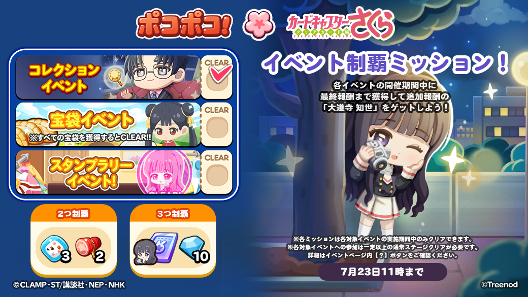 期間中、開催される「コレクション」「宝袋」「スタンプラリー」イベントを最後までクリアすると、コラボ限定仲間の「大道寺 知世」を獲得することができます。