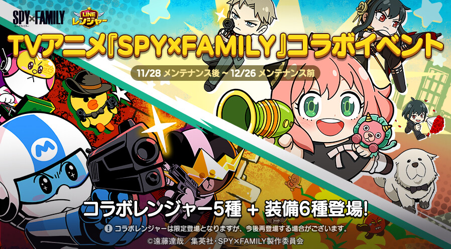 本コラボレーションでは、TVアニメ『SPY×FAMILY』から「ロイド」「アーニャ」「ヨル」「ボンド」「ユーリ」がコラボ限定のレンジャーとして登場するほか、コラボ限定のLINEスタンプを配信します。