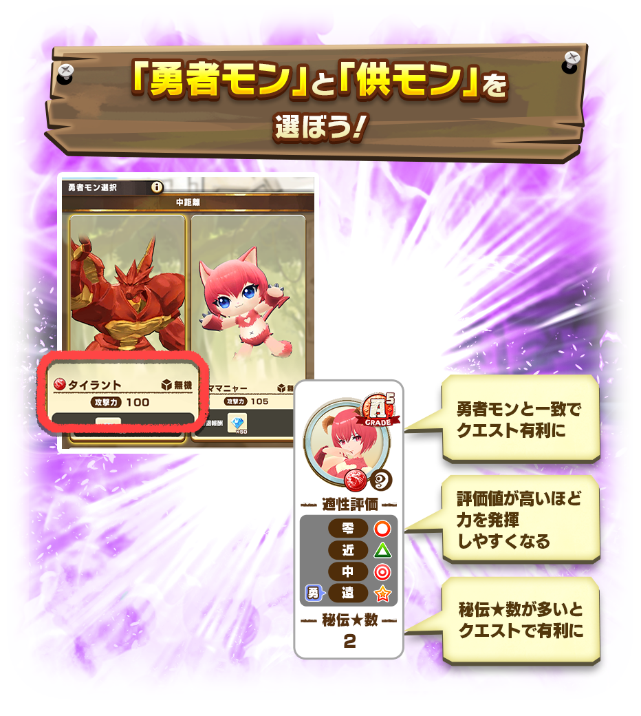 プレイヤーは、各地のブリーダー協会が選抜した特別なモンスター「勇者モン」とともに、自らが育てた「供(とも)モン」たちを派遣し、4つの距離(零/近/中/遠)に分かれたクエストへと挑みます。