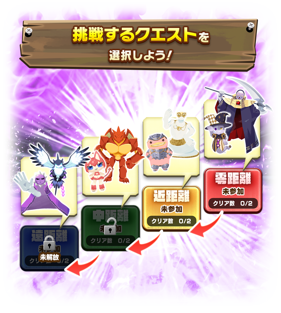 零/近/中/遠からなる4距離の各クエストは、それぞれ9Wave構成となっており戦いを重ねるごとに勇者モンが強化されます。