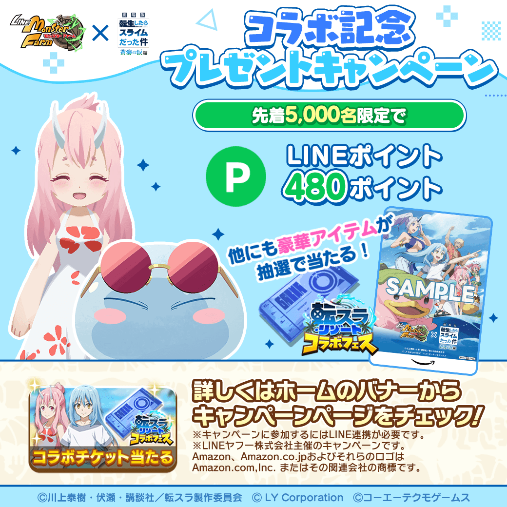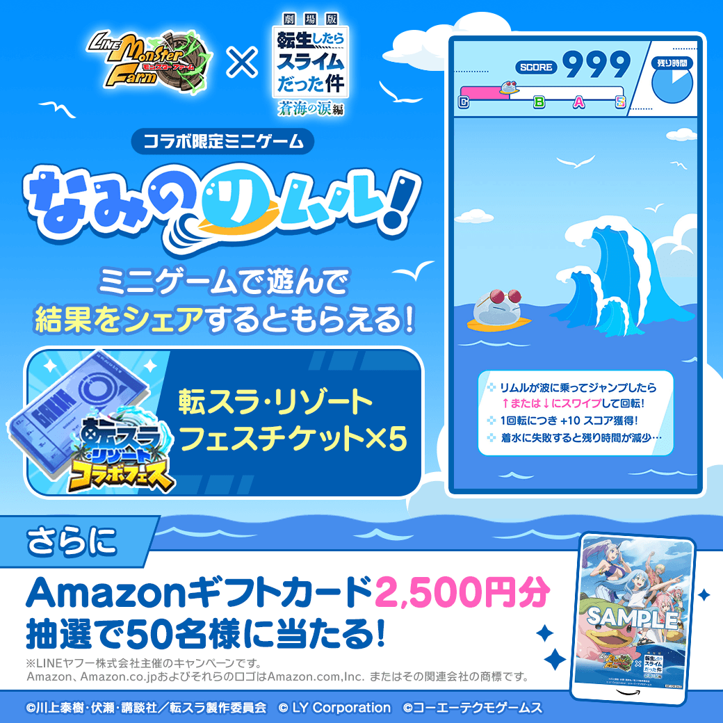 『劇場版 転生したらスライムだった件 蒼海の涙編』コラボを記念して、公式X(@MonsterFarm_L)をフォローして該当のキャンペーン投稿をリポストすると、ゲーム内より抽選でコラボオリジナルデザイン Amazonギフトカード 2,500円分や「転スラ・リゾートフェスチケット」がその場で当たります。