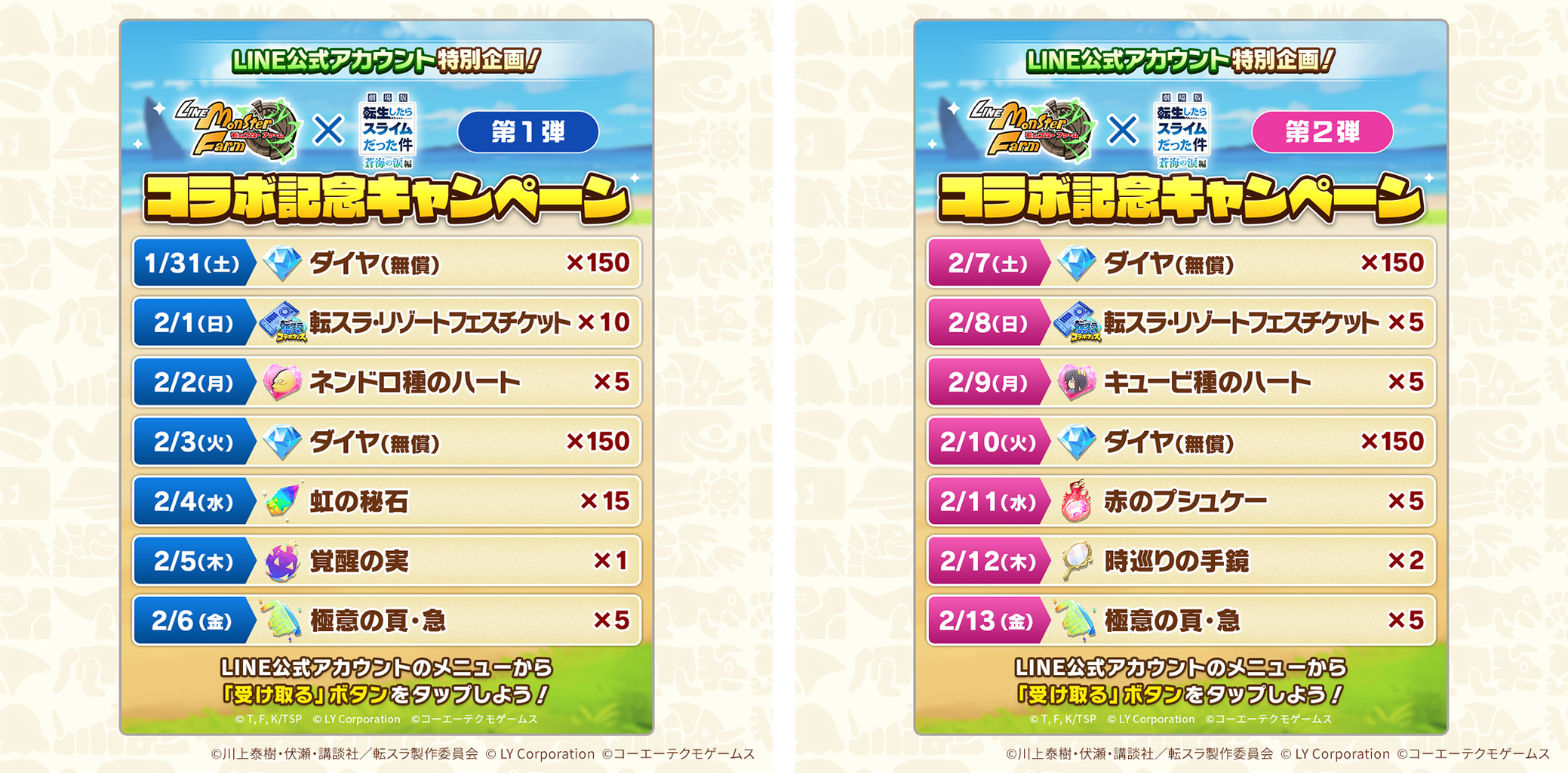LINE公式アカウント(https://lin.ee/gIIu7AE)のメニューより「受け取る」ボタンをタップすると、豪華アイテムをお受け取りいただけます。