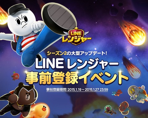 キャンペーン LINE レンジャー 2015年01月20日 【アップデート完了】近日「LINE レンジャー」がシーズン2解禁!新登場の★6レンジャー&100ルビーを必ずもらえる事前登録スタート 【追記】1月23日、アップデートが完了いたしました(事前登録は1月27日まで受付中)。ぜひ遊んでみてください!近日、防衛バトルゲーム「LINE レンジャー」が大型アップデートし、シーズン2を解禁します!新規エリアはついにエイリアン軍団"メフィスト軍"の駐屯地へ。あなた